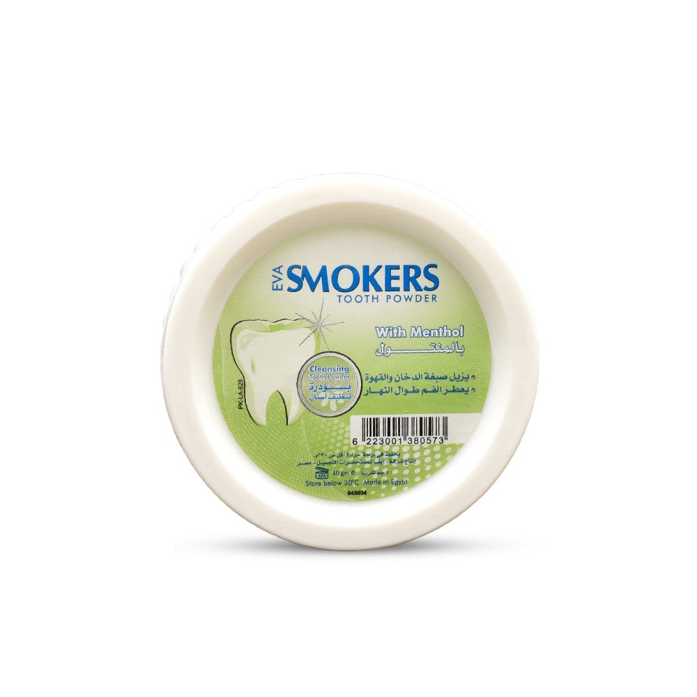 بودرة إيفا سموكر لتنظيف الأسنان بالمنثول، المصممة خصيصًا للعناية بأسنان المدخنين ومحبي القهوة.