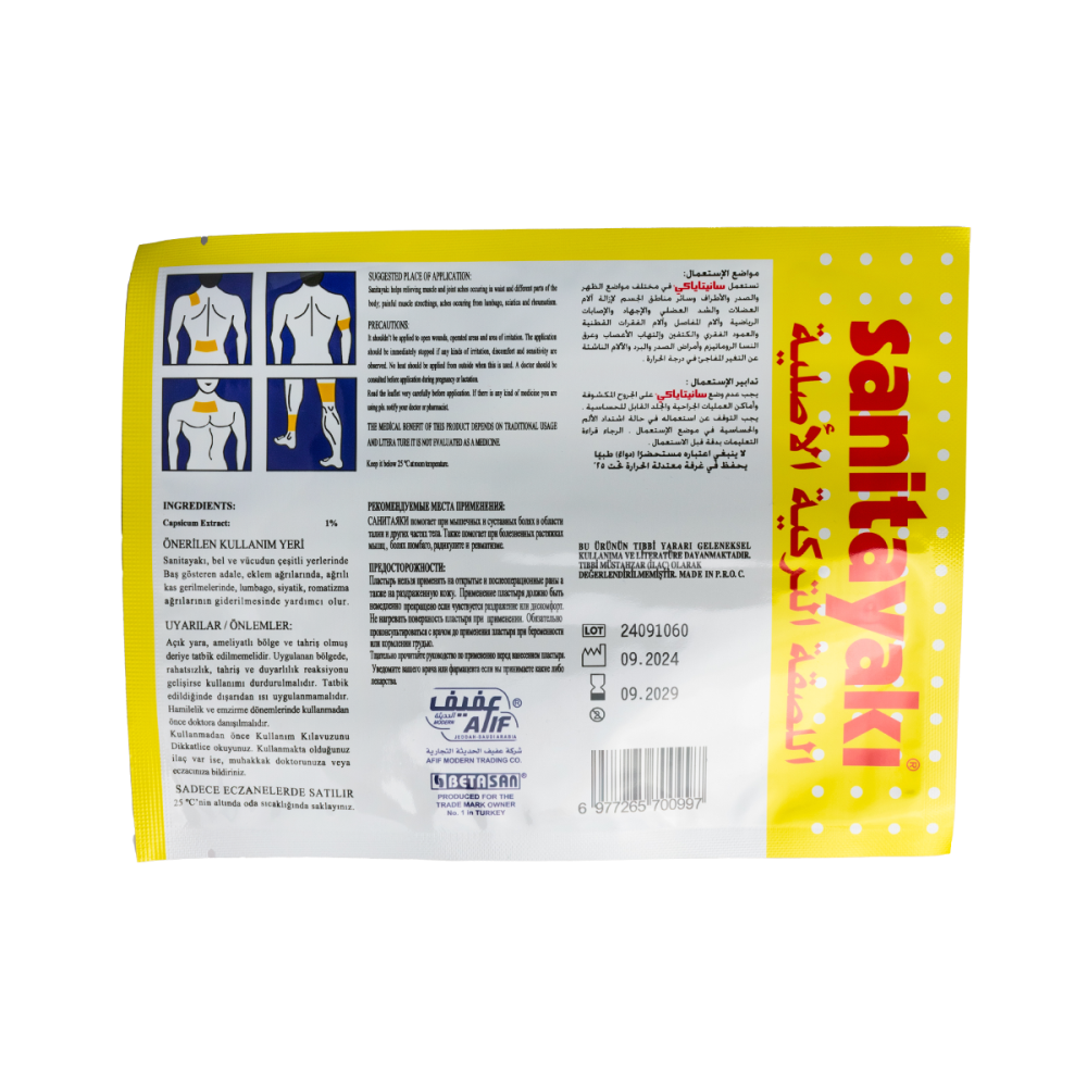 لصقة سانيتاياكي هي لصقة موضعية تحتوي على خلاصة الفليفلة (Capsicum Extract) بتركيز 1%، والتي تعمل على توليد شعور بالدفء في منطقة التطبيق.