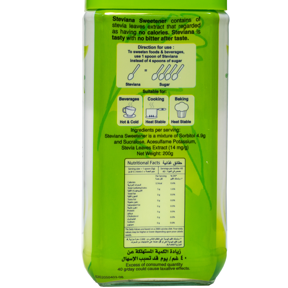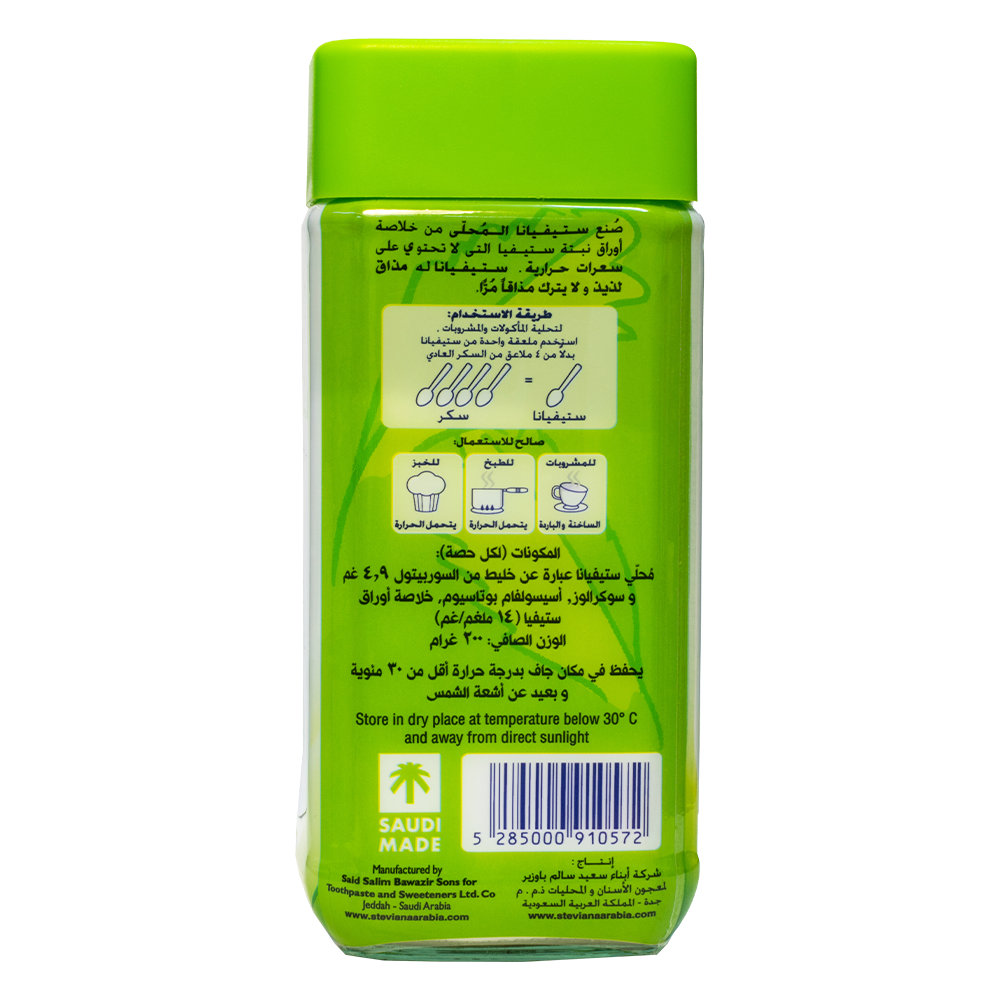 يحتوي علي خلاصة أوراق ستيفيا والتي ليس لها سعرات حرارية ولذيذة ولا يترك مذاقا مراً