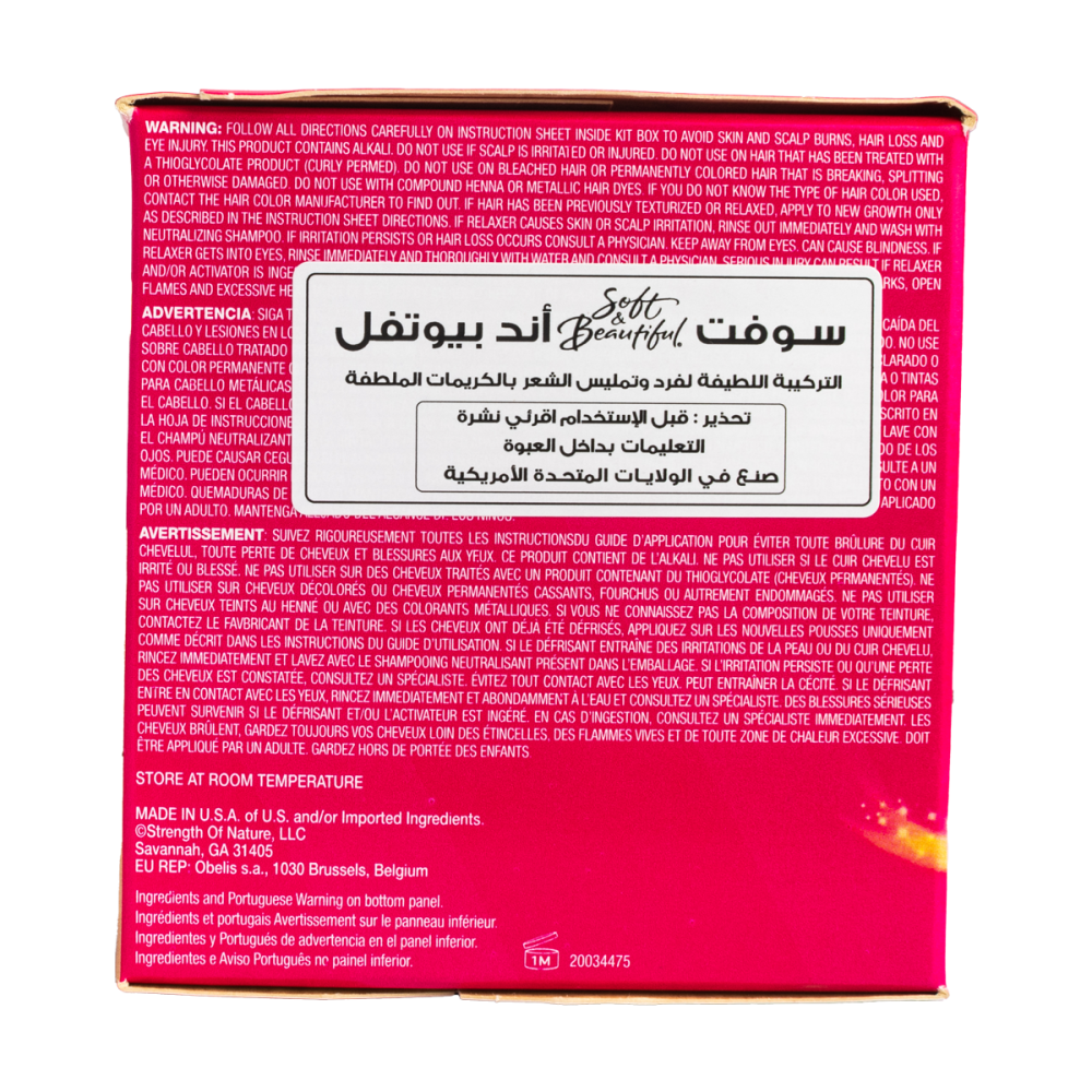 اكتشفي سر الشعر الأملس، الناعم، والصحي مع نظام فرد الشعر سوفت آند بيوتيفول خالٍ من هيدروكسيد الصوديوم (Soft & Beautiful No-Lye Ultimate Conditioning Relaxer System). هذا النظام المتكامل، المصمم بقوة عادية (Regular)، يقدم تجربة فرد استثنائية مع عناية فائقة وترطيب عميق، ليمنحك شعراً سهل التسريح، مليئاً بالحيوية، واللمعان، وبملمس ناعم يدوم طويلاً.