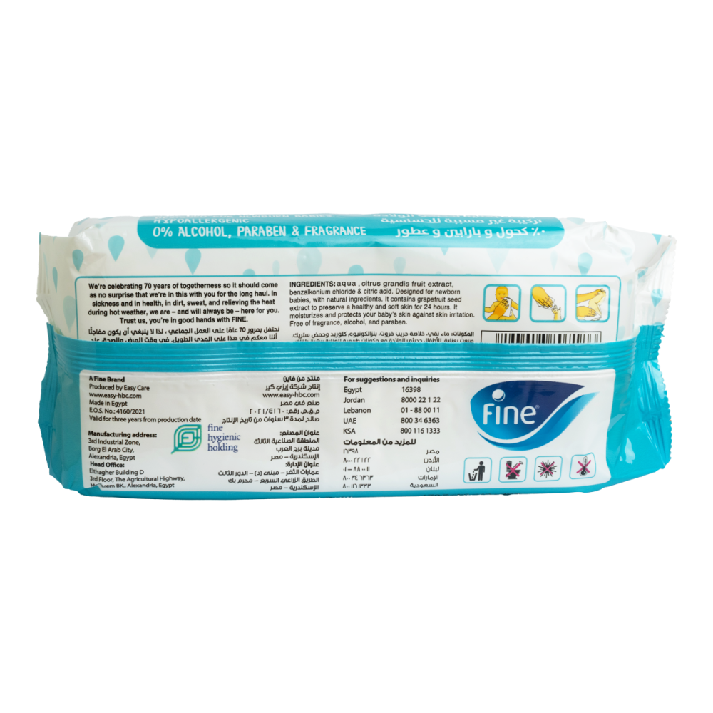 مناديل فاين المائية لا تسبب الحساسية (Hypoallergenic) وتم اختبارها من قبل أطباء الجلدية، وهي خالية تماماً من الكحول، البارابين والعطور (٠٪ كحول و بارابين و عطور)، مما يجعلها الخيار الأمثل والأكثر أماناً لبشرة طفلك.