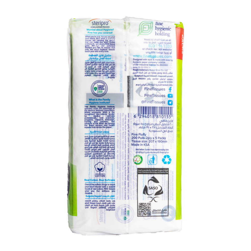 تتميز مناديل فاين فلافي بـ نعومة حقيقية مستوحاة من القطن، فهي ألطف شيء يلامس وجهك، لتمنح بشرتك الرقيقة عناية لطيفة ومريحة.