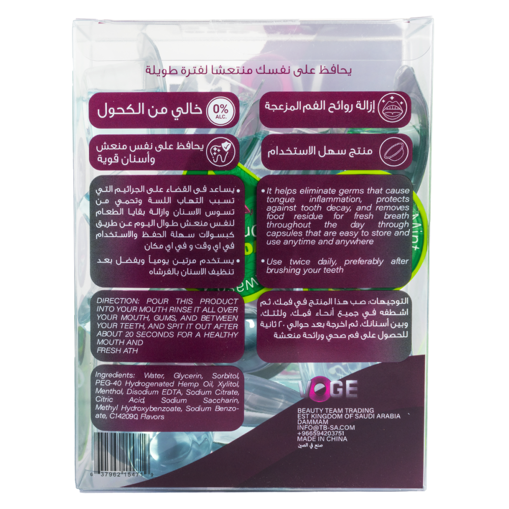 هو عبارة عن غسول فم مركّز بنكهة النعناع، يأتي في كبسولات فردية سهلة الاستخدام، مصممة لتمنحك انتعاشًا فوريًا وحماية متكاملة أينما كنت.