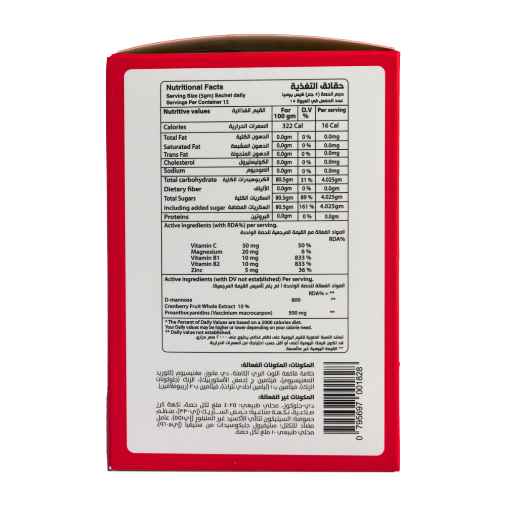 يحتوي على خلاصة التوت البري، دي-مانوز، فيتامينات ومعادن.