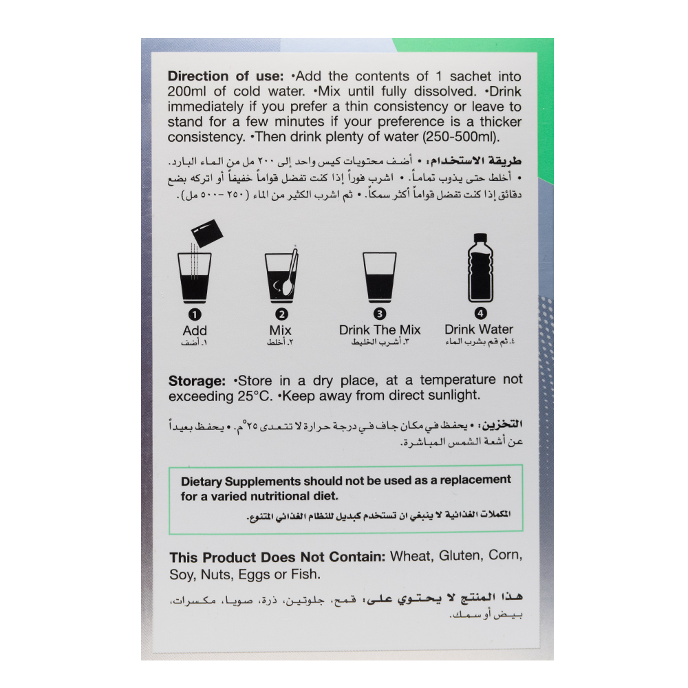 - أضف محتويات كيس واحد الي 200 مل ماء بارد ثم اخلط حتي تمام الذوبان واشرب فورا