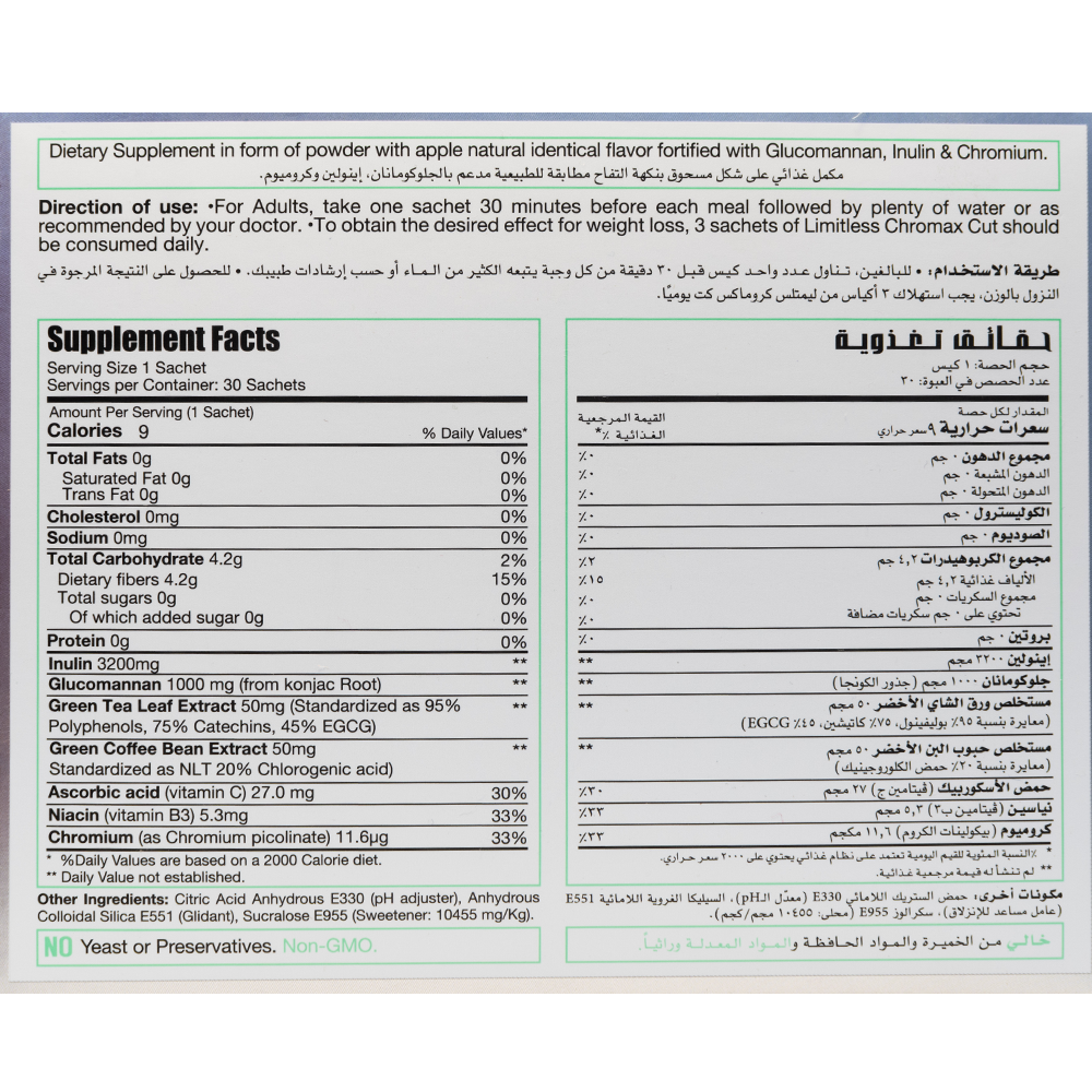 مكمل غذائي علي شكل مسحوق بنكهة التفاح مطابقة للطبيعية مدعم بالجلوكومانان + اينولين + كروميوم