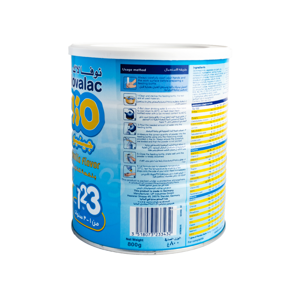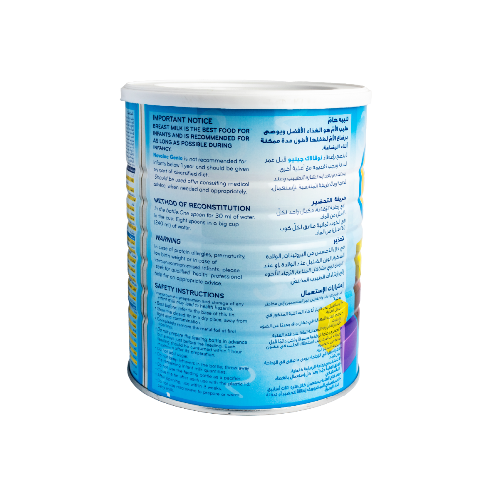 - تركيبة نمو متقدمة: يوفر نوفالاك جينيو تركيبة غذائية متوازنة، مدعمة بالفيتامينات والمعادن الأساسية التي يحتاجها طفلك في مرحلة النمو السريع من 1 إلى 3 سنوات.