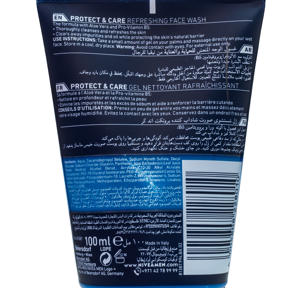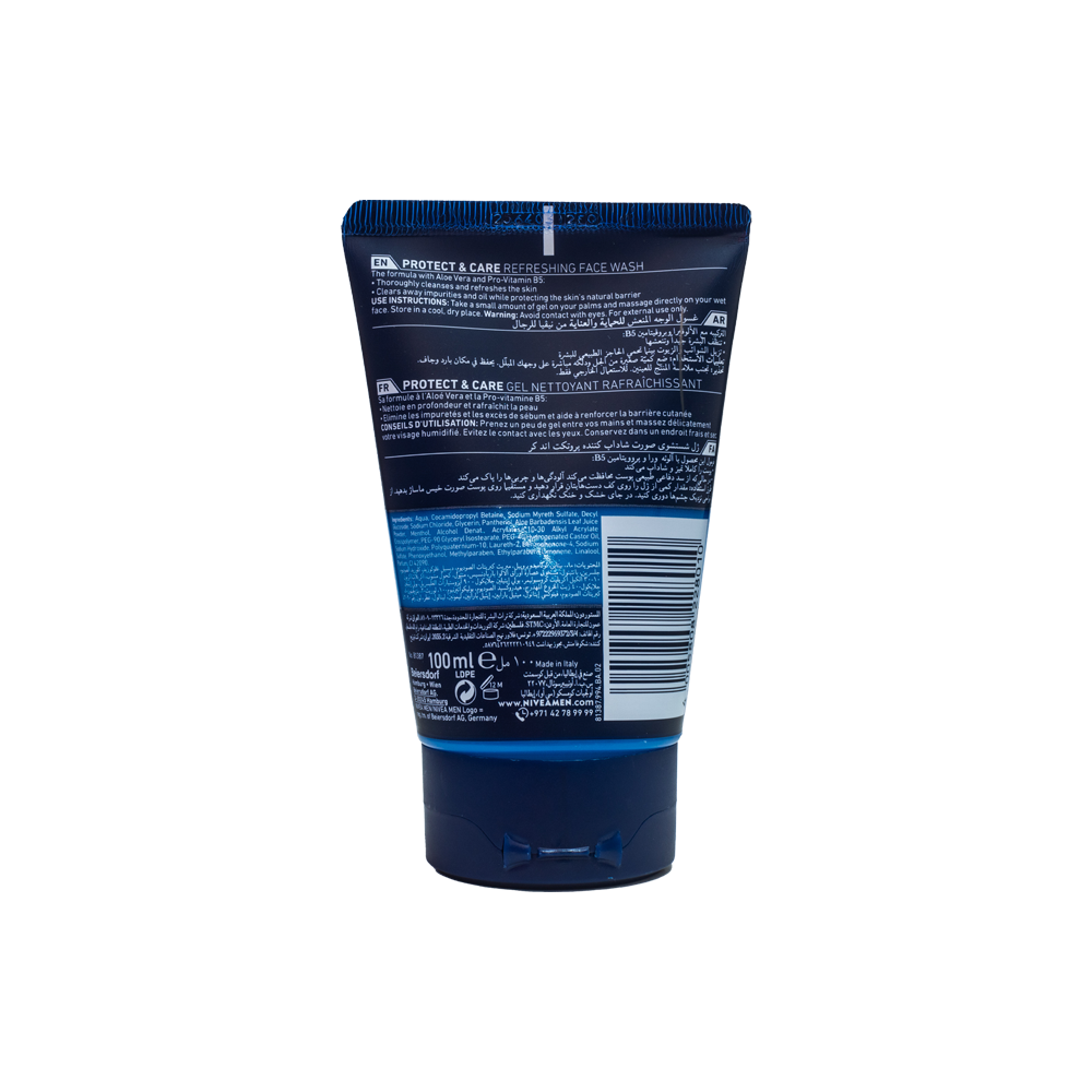 ارتقِ بروتين العناية ببشرتك مع غسول الوجه المنعش للرجال من نيفيا (NIVEA MEN Protect & Care) بالصبار (الألوفيرا). صُمم هذا الغسول اليومي خصيصًا ليمنحك انتعاشًا فوريًا وتنظيفًا عميقًا، مزيلاً الشوائب والزيوت الزائدة بفعالية. بفضل تركيبته الغنية بخلاصة الصبار المهدئة، ستحظى ببشرة نظيفة، منتعشة، ومحمية دون أي إحساس بالجفاف.