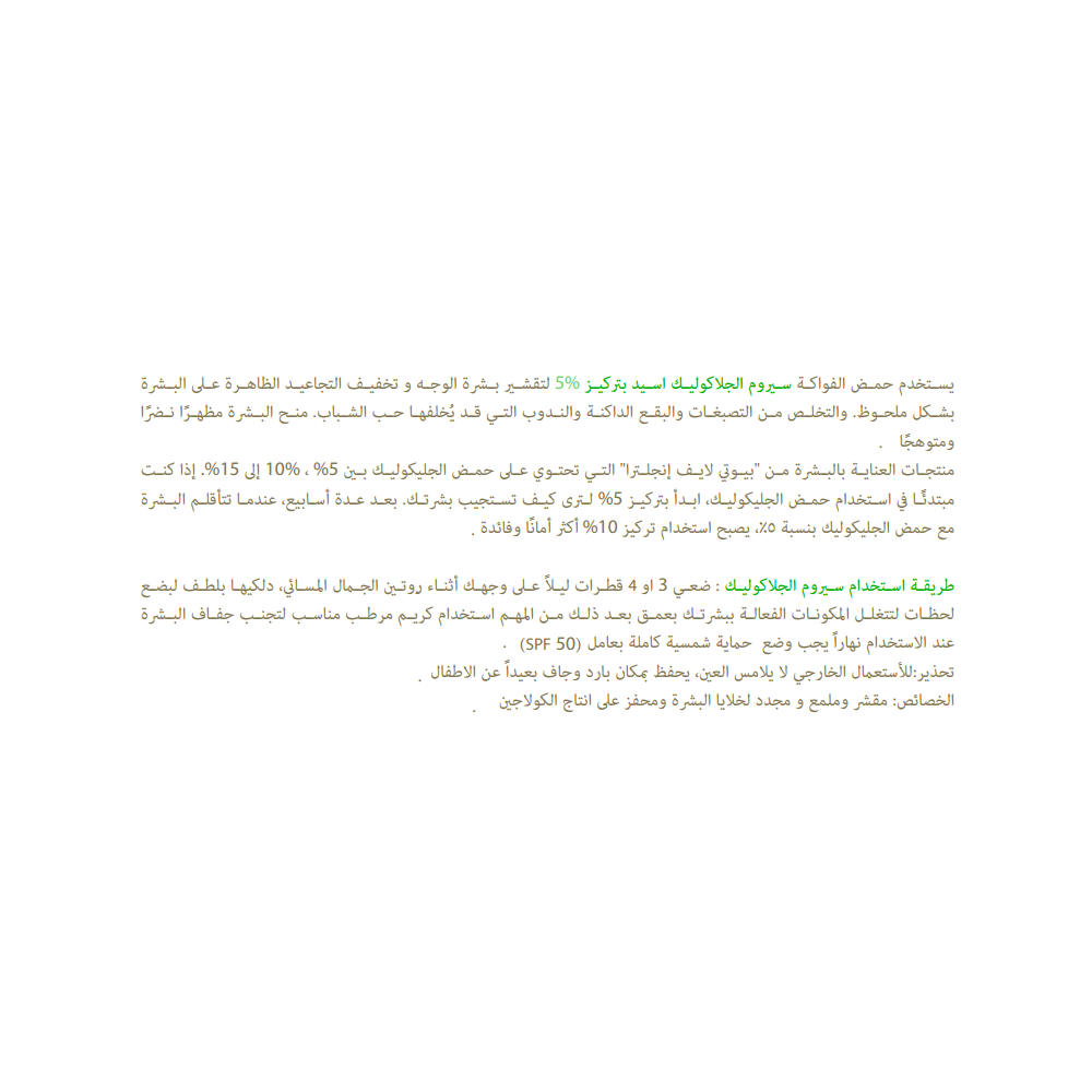 تتراوح تركيزات منتجات العناية بالبشرة من Beauty life التي تحتوي على حمض الجليكوليك من 5% إلى 10%.