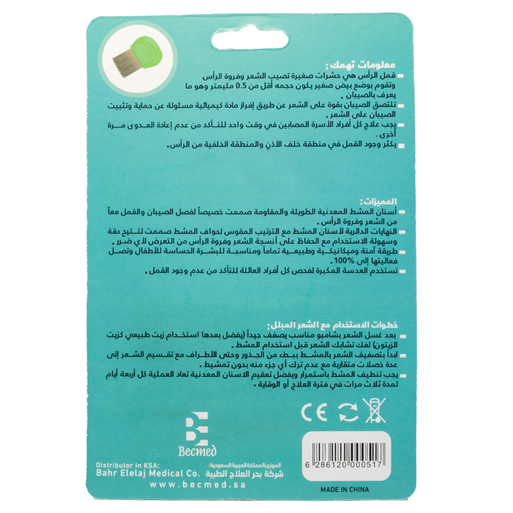 - علاج متكامل: لتعزيز فعالية العلاج والقضاء على القمل نهائياً، يُنصح باستخدام مشط BEC LICE COMB بالتزامن مع شامبو أو مستحضر خاص بالقمل حسب توجيهات الصيدلي.