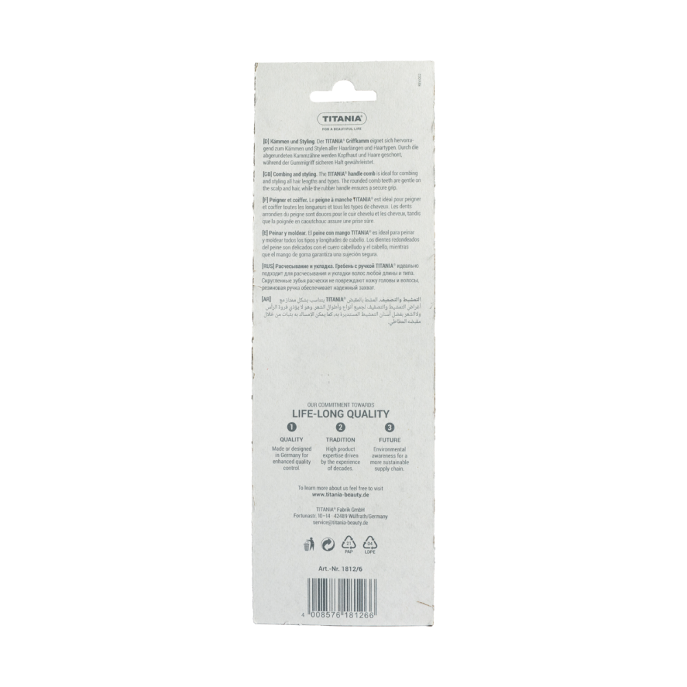 حافظوا على جمال شعركم الطبيعي واستمتعوا بتصفيف سهل ومريح مع مشط تيتانيا بمقبض مريح (Griffkamm)، المصمم بعناية فائقة ليلائم جميع أنواع وأطوال الشعر. هذا المشط المبتكر، بجودته الألمانية الموثوقة وتصميمه الصديق للبيئة، يوفر لكم فكاً لطيفاً للتشابك وتصفيفاً سريعاً، ليمنحكم شعراً ناعماً، لامعاً، وصحياً ينبض بالحياة والجمال.